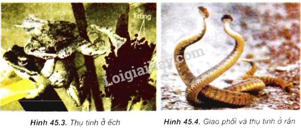 - Hãy cho biết thụ tinh của ếch (hình 45.3), ở rắn (hình 45.4) là hình thức thụ tinh ngoài hay thụ tinh trong. Tại sao?