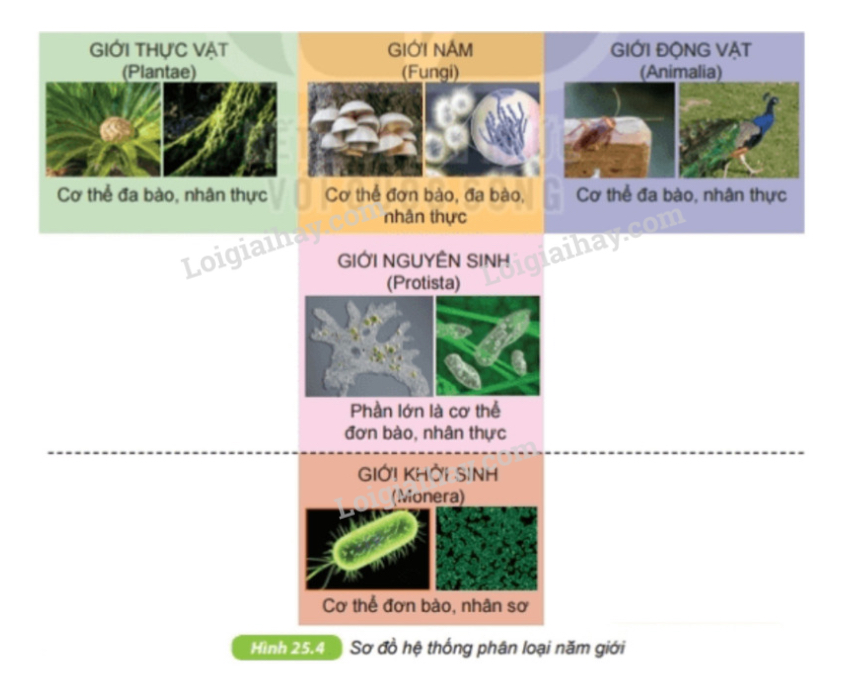 Theo hệ thống phân loại năm giới, sinh vật được chia thành các giới: Khởi sinh, Nguyên sinh, Nấm, Thực vật và Động vật.