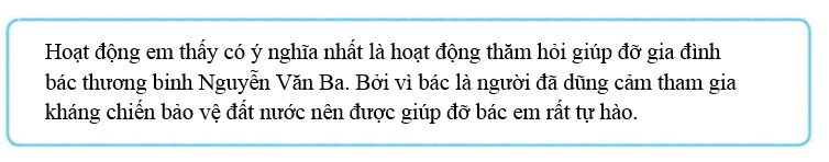 - Trong số các hoạt động vừa kể trên, em cảm thấy hoạt động nào có ý nghĩa nhất, khiến em tự hào nhất? Vì sao em lại chọn hoạt động đó?