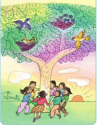 a) Tranh vẽ các bạn nhỏ đang chơi đùa vui vẻ dưới bóng mát của cây. Cây xanh xanh tán lá dài rộng có những chú chim đang làm tổ trên đó.