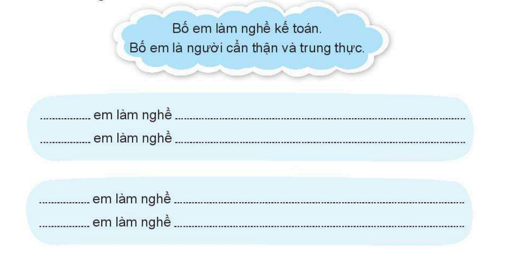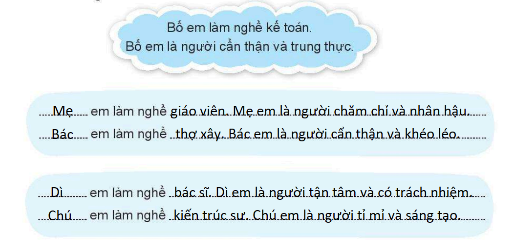 Hãy hỏi 4 người thân trong gia đình em (bố, mẹ, chú, dì, cô, bác,...) về nghề nghiệp và những đặc trưng về tính cách theo công việc của họ, ghi lại vào chỗ chấm theo mẫu.
