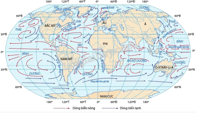 Hình 19.3. Lược đồ các dòng biển trên đại dương thế giới