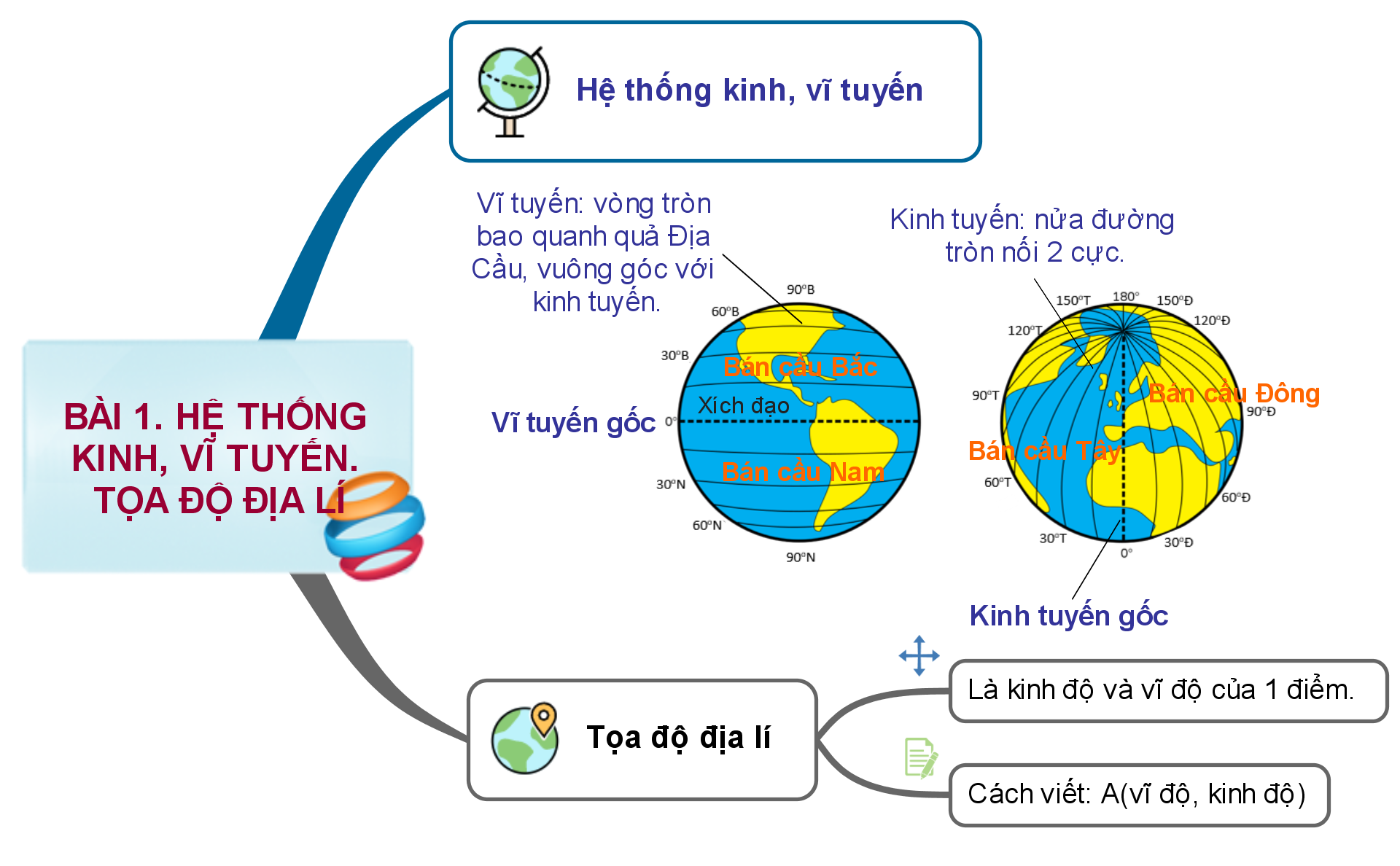 Sơ đồ tư duy hệ thống kinh, vĩ tuyến. Tọa độ địa lí Địa lí 6 Kết nối tri thức với cuộc sống
