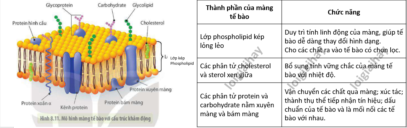Mô hình cấu trúc màng tế bào gọi là mô hình khảm lỏng với nhiều thành phần, mỗi thành phần đảm nhận các chức năng riêng biệt: