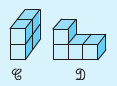 Hình C gồm 4 hình lập phương như nhau và hình D cũng gồm 4 hình lập phương như thế. Ta nói: Thể tích hình C bằng thể tích hình D.