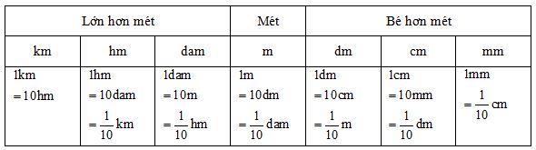 Nhận xét: Trong bảng đơn vị đo độ dài, hai đơn vị đo liền nhau hơn (kém) nhau \(10\) lần, tức là: