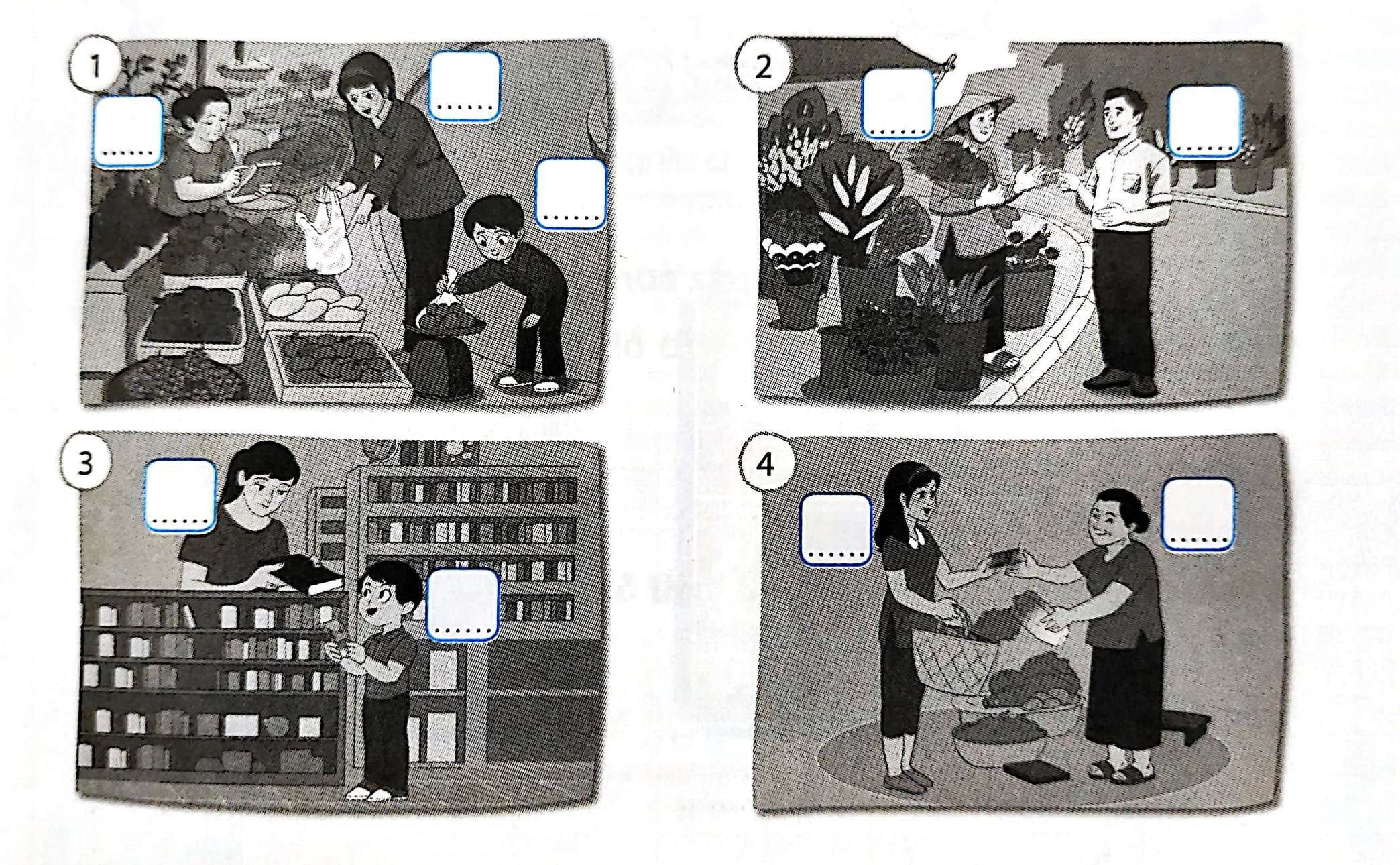 Viết chữ M vào hình người mua, viết chữ B vào hình người bán trong các tranh sau: