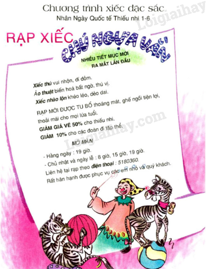 Em đọc tờ quảng cáo và chọn nội dung mình thích như: tên rạp, những tiết mục thú vị, giảm giá vé, thời gian phục vụ,...