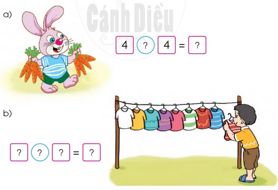 Nêu các phép tính thích hợp với mỗi tranh vẽ: