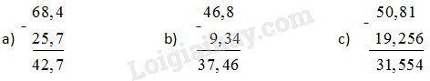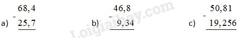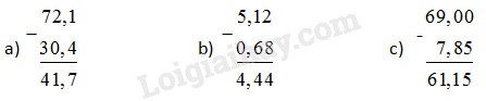 Lưu ý với câu c: Coi \(69 = 69,00\) ta thực hiện phép tính \(69,00 - 7,85\) như bình thường.