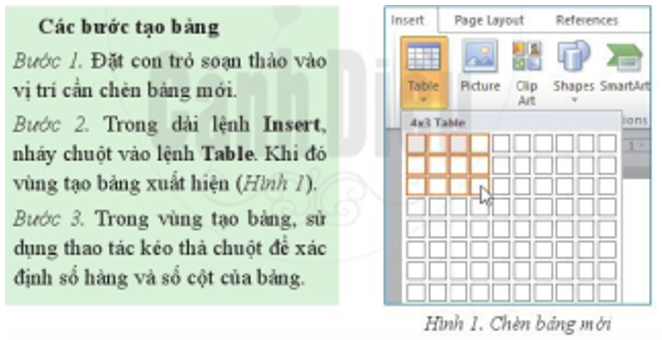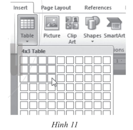 Em hãy điền vào chỗ chấm (...) các cụm từ: cần chèn bảng, Insert, Tables, vùng tạo bảng thích hợp để nhận được các bước tạo bảng trong phần mềm Soạn thảo văn bản (Hình 11):