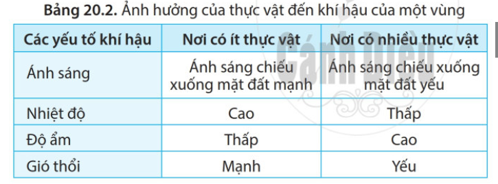 a) Dựa vào bảng 20.2, hãy cho biết khí hậu ở nơi có nhiều thực vật và nơi có ít thực vật khác nhau như thế nào.