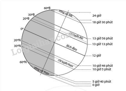 Hình 7.5. Độ dài ban ngày ở các vĩ độ khác nhau vào ngày 22-06