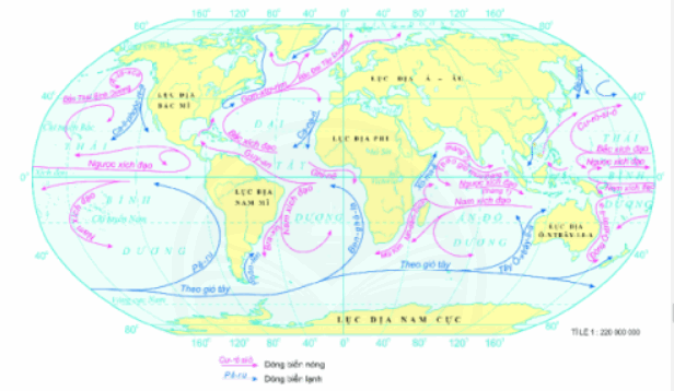 + Dòng biển nóng: Nam xích đạo, Bắc Thái Bình Dương, A-lax-ca, Gơn-xto-rim, Bắc Đại Tây Dương, Ghi-nê, Guy-an, Bra-xin, Mô-dăm-bích, Cư-rô-si-ô, Bắc xích đạo, dòng đông Ô-xtray-li-a.