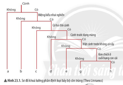 Quan sát hình 23.1, em hãy nêu các đặc điểm dùng để phân loại bảy bộ côn trùng.