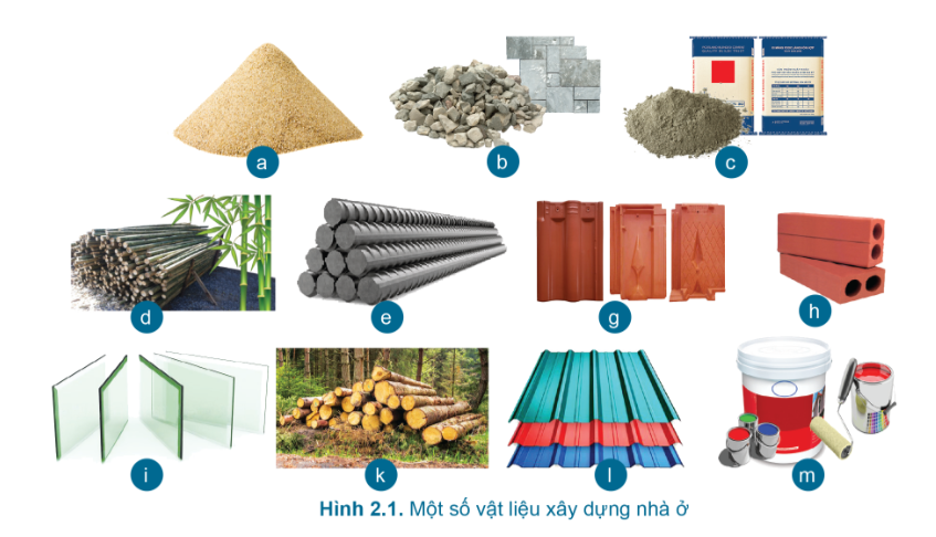 1. Hãy quan sát và nêu tên các vật liệu xây dựng nhà ở trong hình 2.1 2. Kể thêm các vật liệu xây dựng nhà ở khác