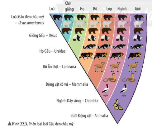 Từ cách phân loại loài Gấu đen châu mỹ, em hãy cho biết các bậc phân loại của loài Gấu trắng trong hình 22.3.