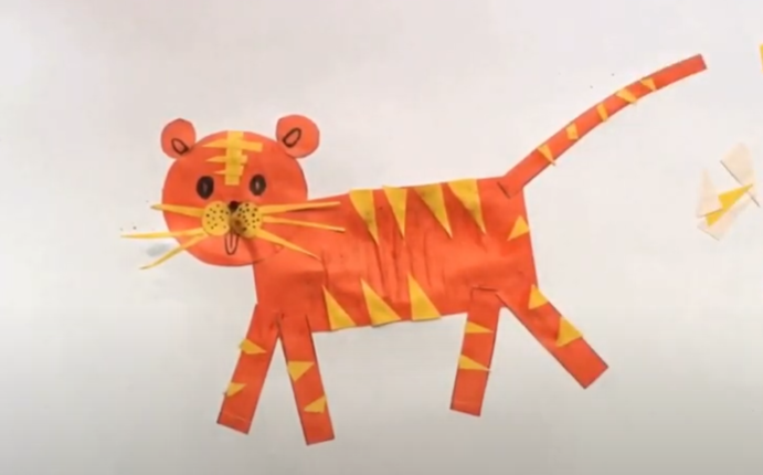- Các hình đều được lặp lại vì trên chú hổ có nhiều bộ phận mang các hình giống nhau, màu 2 màu đơn giản: cam và vàng