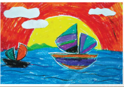 Sản phẩm mỹ thuật em yêu thích là bức tranh dưới đây, cảnh bầu trời và biển trong hoàng hôn với cách sử dụng màu tương phản mạnh của bạn ấy (màu đậm: đỏ, xanh, màu nhạt: vàng, xanh lá, tím)