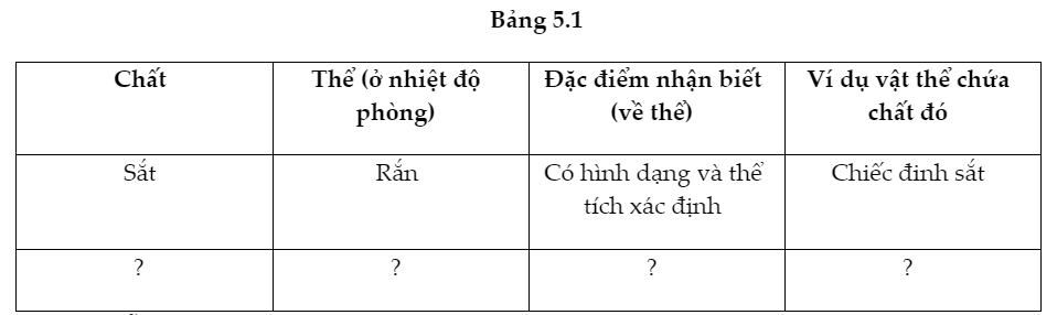 Tìm hiểu những chất quanh em để hoàn thành bảng theo gợi ý sau:Bảng 5.1 Chất Thể (ở nhiệt độ phòng) Đặc điểm nhận biết (về thể) Ví dụ vật thể chứa chất đó Sắt Rắn Có hình dạng và thể tích xác định Chiếc đinh sắt